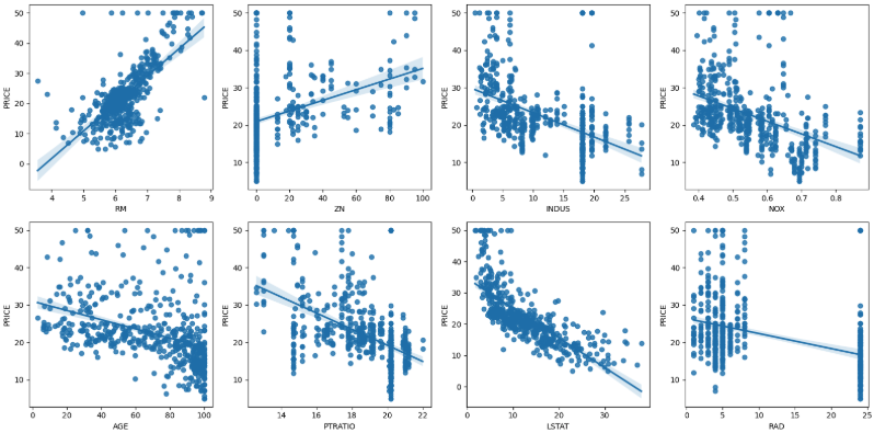 im_features = ['RM', 'ZN', 'INDUS', 'NOX', 'AGE', 'PTRATIO', 'LSTAT', 'RAD']