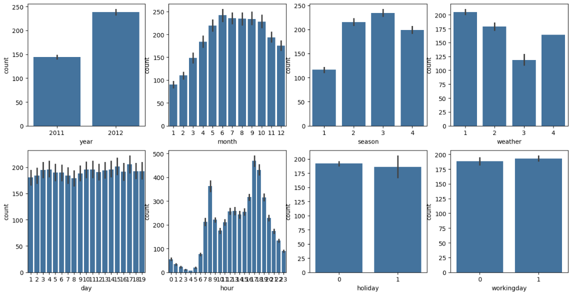 cat_features = ['year','month','season','weather', 'day', 'hour','holiday','workingday']