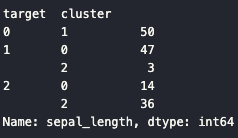 iris_result = irisDF.groupby(['target', 'cluster'])['sepal_length'].count()