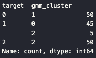 iris_result = irisDF.groupby(['target'])['gmm_cluster'].value_counts()