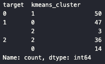 iris_result = irisDF.groupby(['target'])['kmeans_cluster'].value_counts()