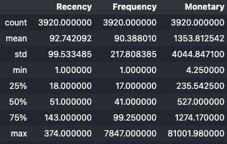 - 이제 고객 한 명당 한 행(row)을 가지는 RFM 테이블이 생성되었습니다.